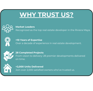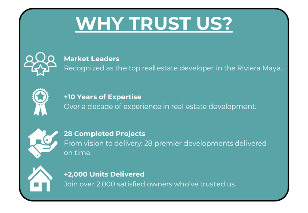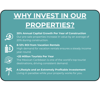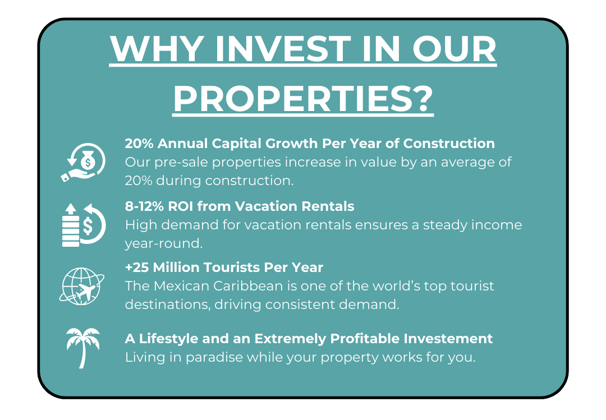 Real estate success isn’t about luck—it’s about making the right decision, at the right time, in the right place. The right time? It’s now. The right place? The Mexican Caribbean. Secure your future today buying properties that offer high ROI and a lifestyle that most would dream off.