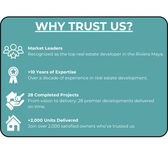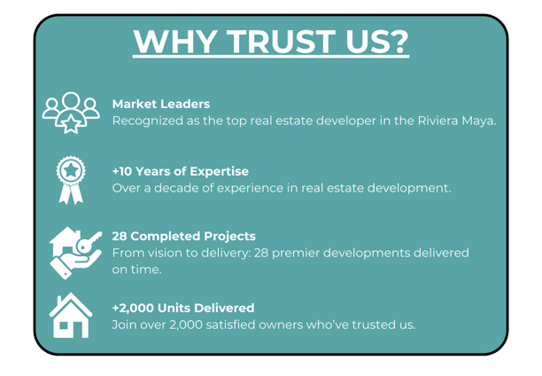 With over a decade of expertise and 28 successful developments in the Mexican Caribbean, we don’t just sell properties—we help investors turn dreams into reality.